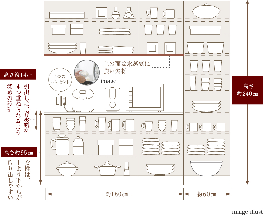 住まう方に寄り添い、使い勝手に配慮した仕様に。高さ約95cmの下部収納には、食器や大きな調理器具などもたっぷり収納できます。 ※タイプにより形状、間口が異なります。