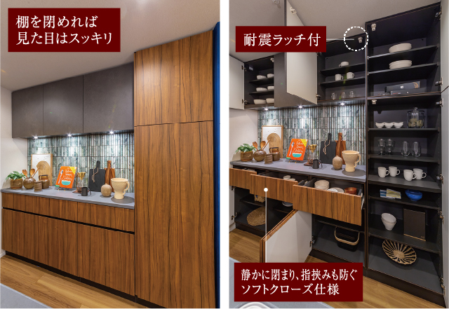 軽く押すだけで、やさしく静かに閉まるので中の食器などを傷めません。