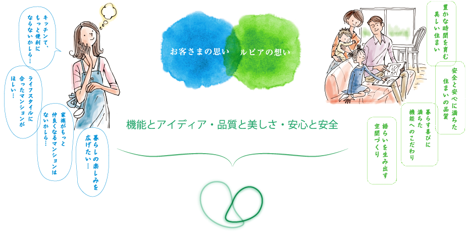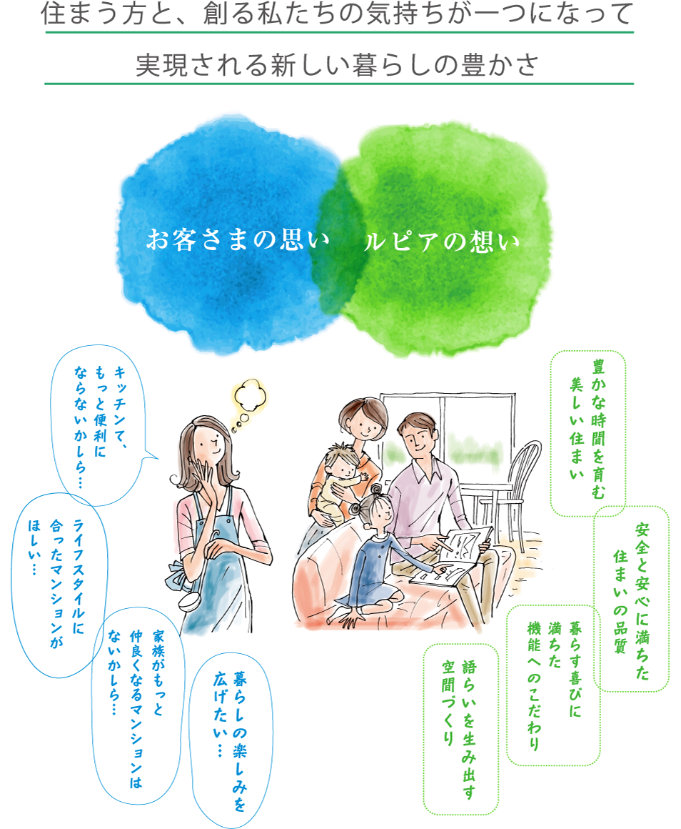 お客さまの思いを、ルピアの想いに。私たちのこだわりは、お客さまと共に暮らす気持ちで住まいの便利や幸せを考えること。 これまで、お客さまのさまざまな声や思いに出会い、一つひとつかなえ、解決しながら、マンションを進化させてきました。その集大成、一つの答えとして誕生した「ルピアコート」。 これからも、お客さまの声に寄り添いながら、笑顔あふれる住まいの品質を追求してまいります。