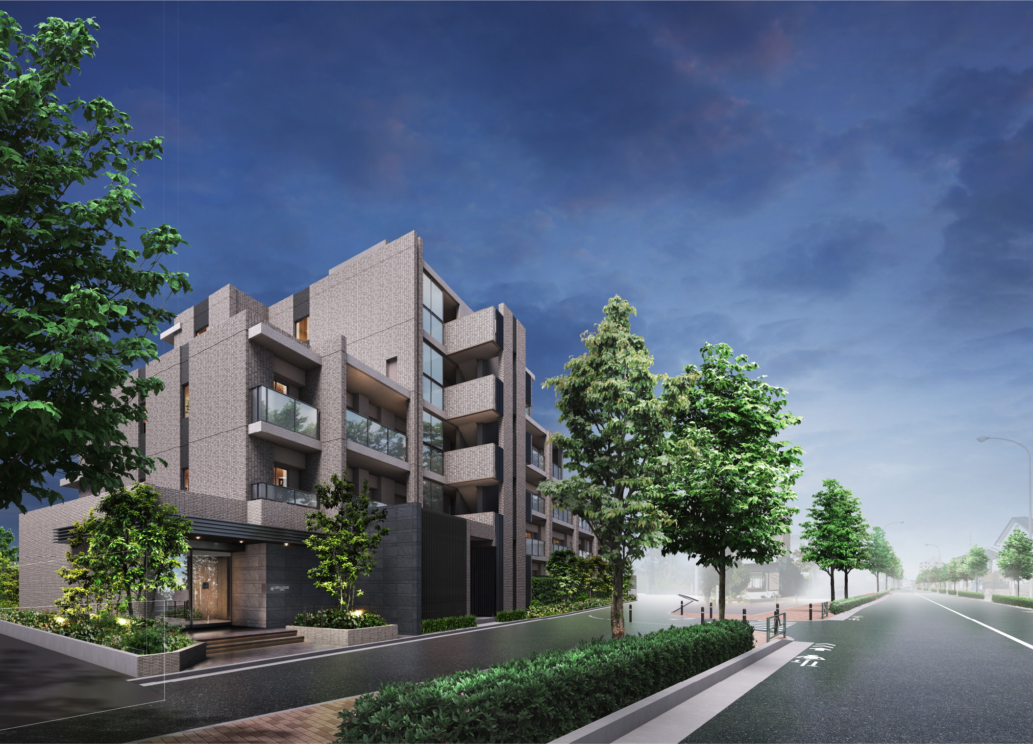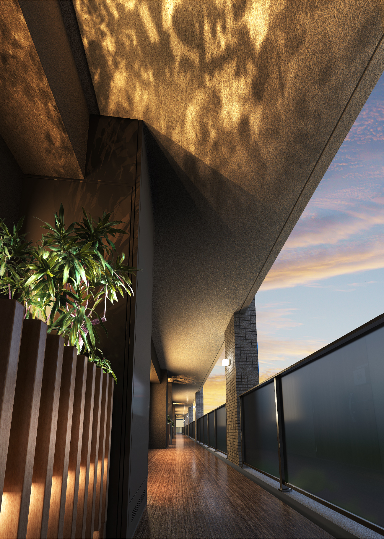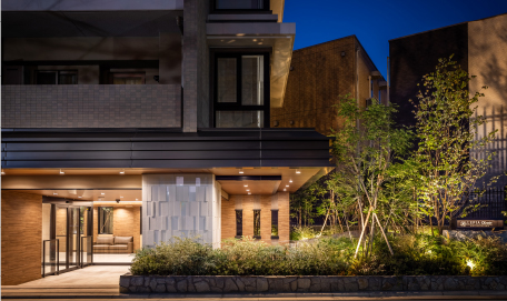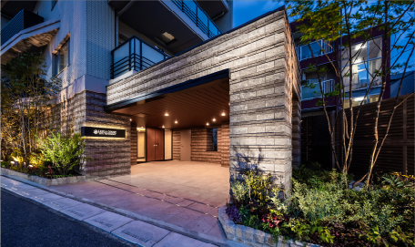 夜の時間帯にも木々のやすらぎを感じられるよう、共用廊下にも植栽を採用。アッパーライトで照らすことにより、枝葉の陰影が建物軒天に映し出される美しいシーンを創造。ドラマチックな雰囲気が邸宅の気品を高めます。