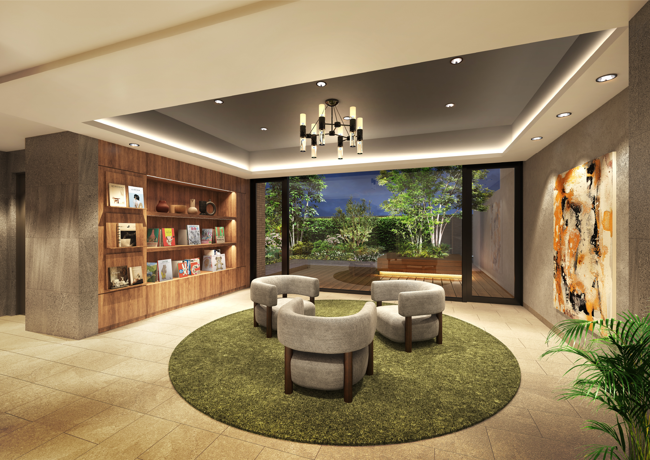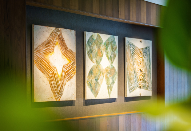 空間を彩り、心を癒すアートをラウンジとホールにご用意。陶器のように重厚な質感を持った絵画は、この邸のために描き下ろされた一点物。世界でひとつだけの美に触れる日常をお愉しみください。