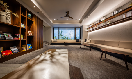南側に設けた大きな窓から、テラスの光と緑が目に飛び込んでくる開放的なラウンジ。庭を見ながらゆったりとした時間を過ごせるよう、上質なソファやこの邸のために選ばれた書籍や絵本をご用意。天気のいい日は、ウッドデッキの「ENGAWAテラス」へ。緑を囲むベンチで読書やお茶など思い思いのくつろぎを。