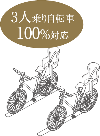 セキュリティエリア内に設置された安心の駐輪場です。3人乗りや電動アシスト式など、重量やサイズの大きい自転車向けのスライドラックを採用。各住戸とも2台分のうち1台は3人乗り自転車が停められます。