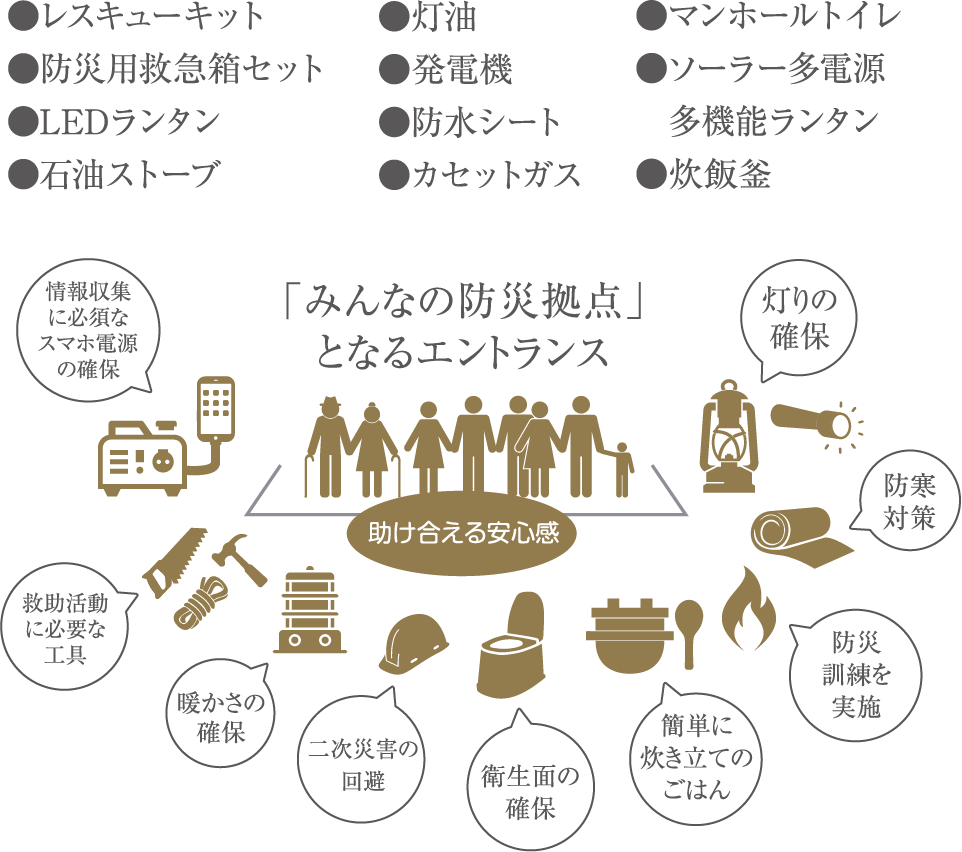 万一の時はみんなで助け合う、という考えから、マンション全体で使える防災グッズを装備。