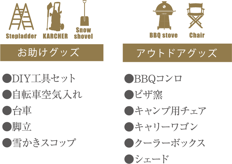 キャンプやホームパーティ、大掃除やDIYなど、たまに必要になる数々のシェアアイテムを保管。