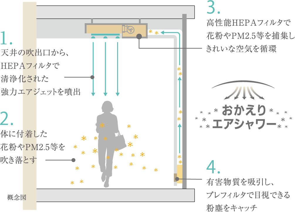 高速エアジェットで花粉やPM2.5などを瞬時に除塵し、集塵。建物内への持ち込みを防ぎます。
