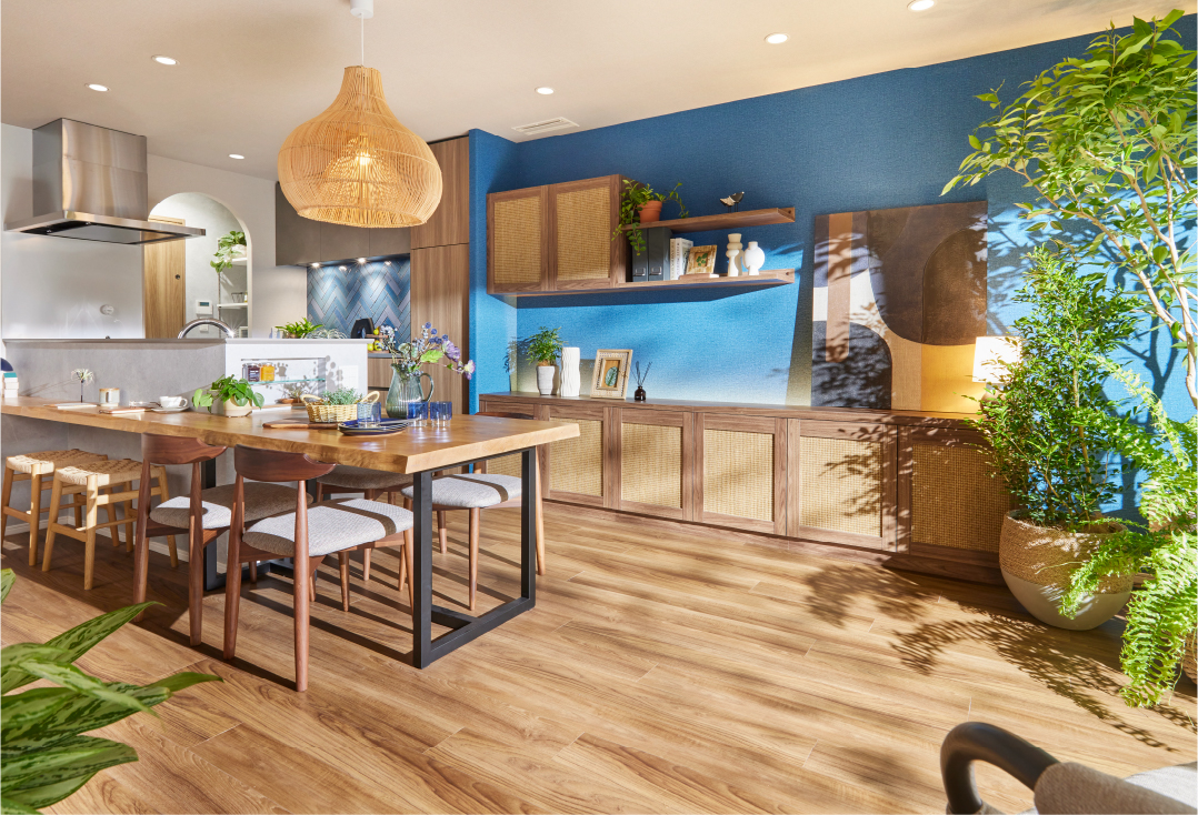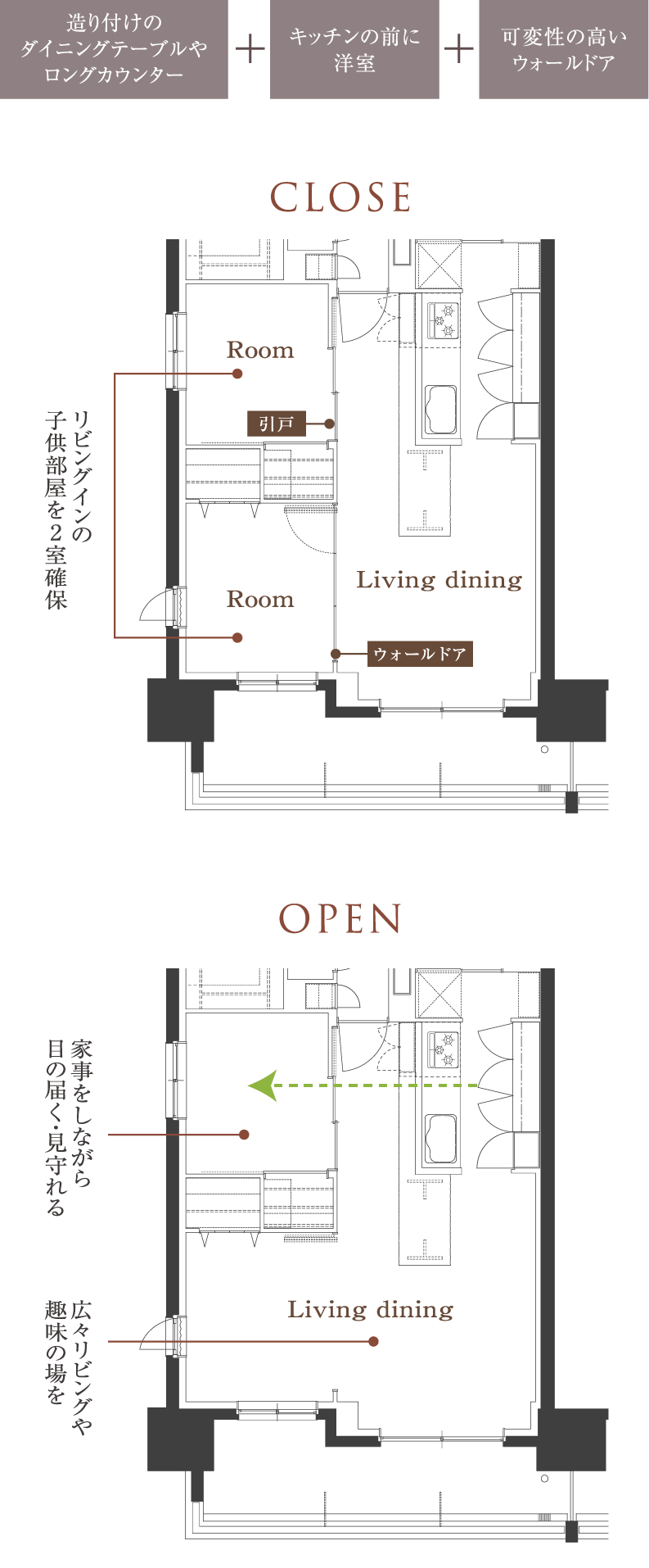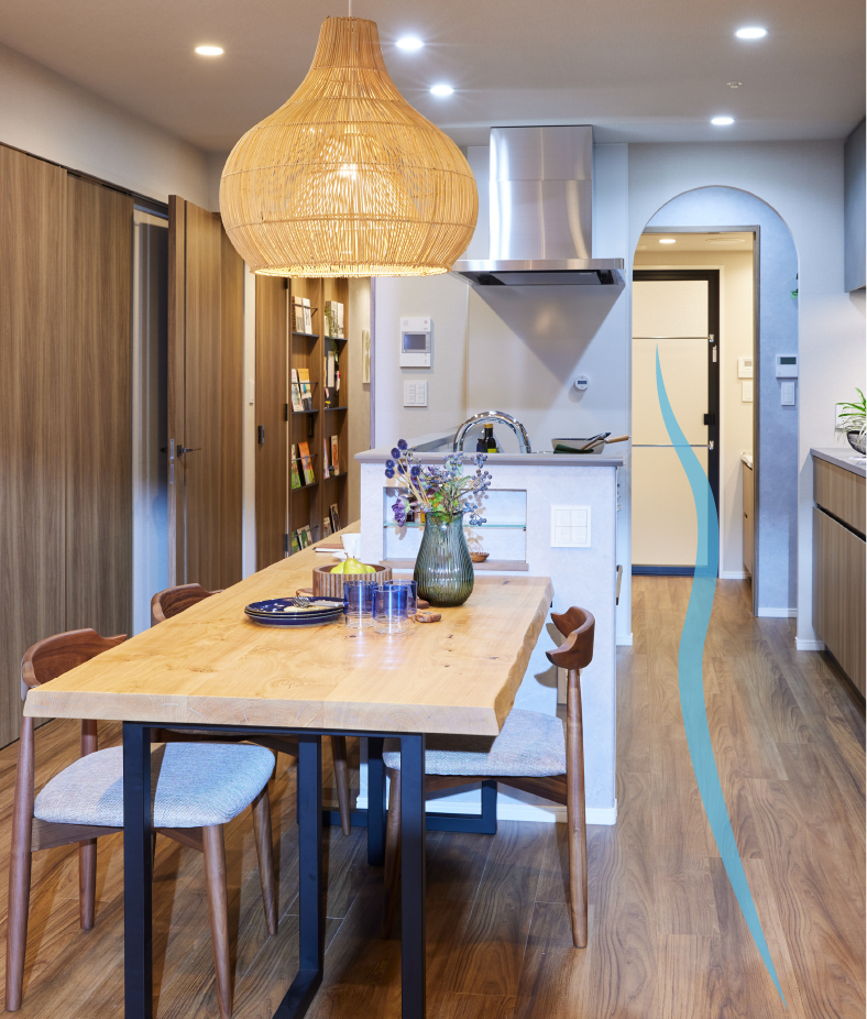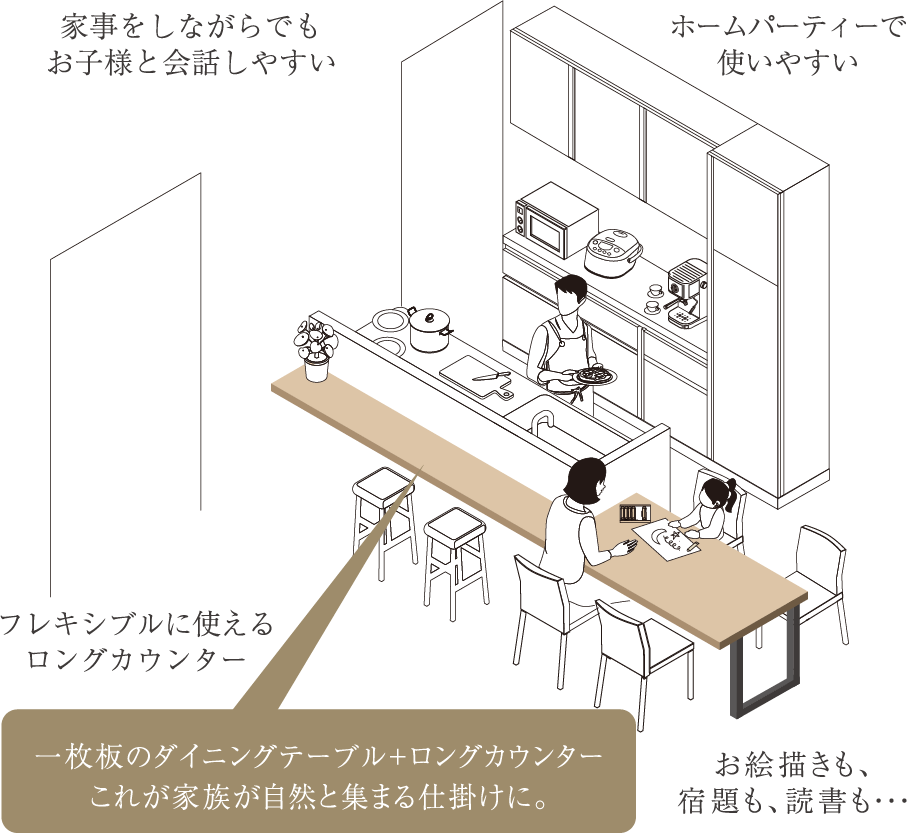 対面式キッチンを「縦」に配置しただけでなく、「造り付けのダイニングテーブルやロングカウンター」があること。「キッチンの前に洋室」が設けられていること、「可変性の高いウォールドア」の採用など。そのすべてが、ピアキッチンプランならではの住み心地に繋がっています。