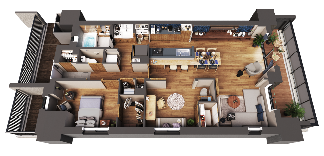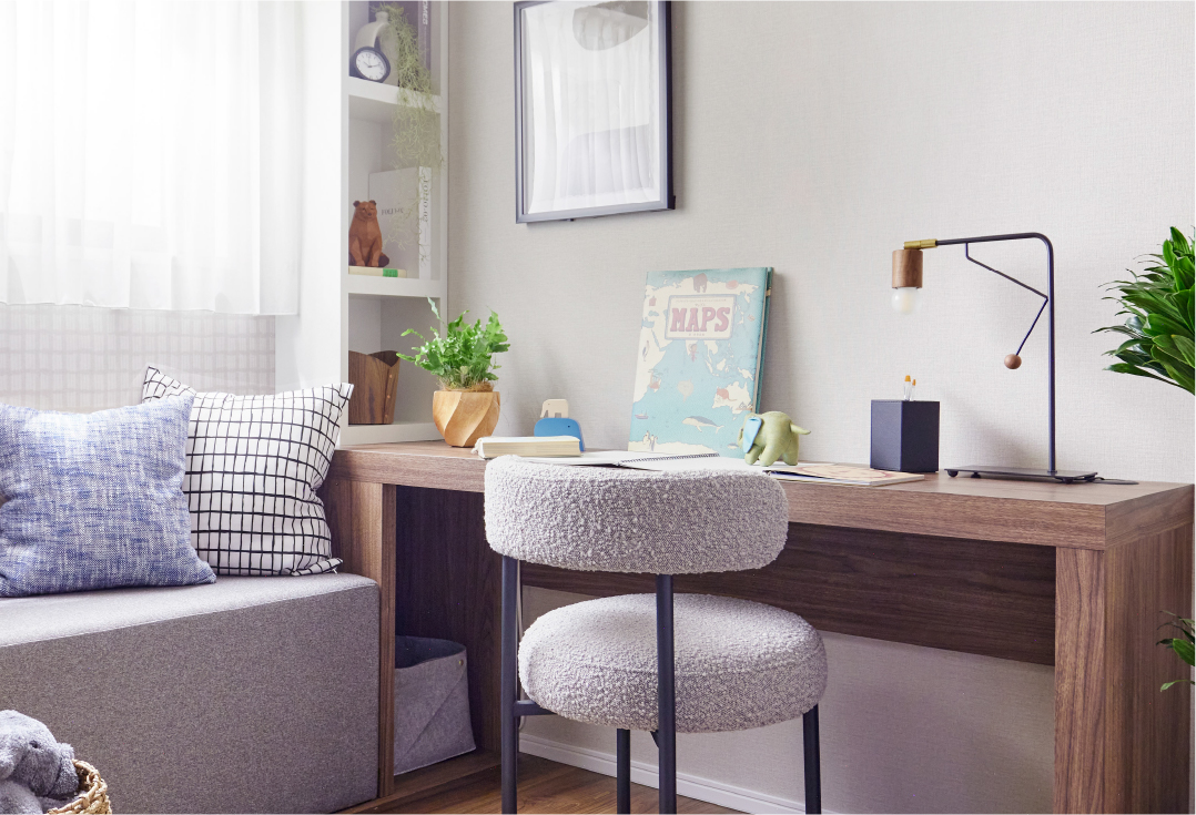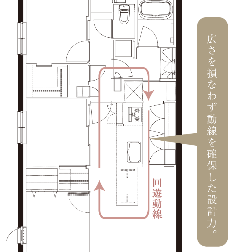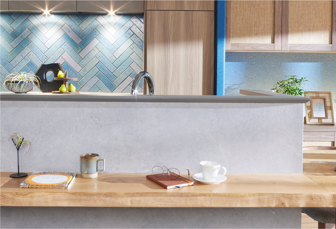 対面式キッチンを「縦」に配置しただけでなく、「造り付けのダイニングテーブルやロングカウンター」があること。「キッチンの前に洋室」が設けられていること、「可変性の高いウォールドア」の採用など。そのすべてが、ピアキッチンプランならではの住み心地に繋がっています。