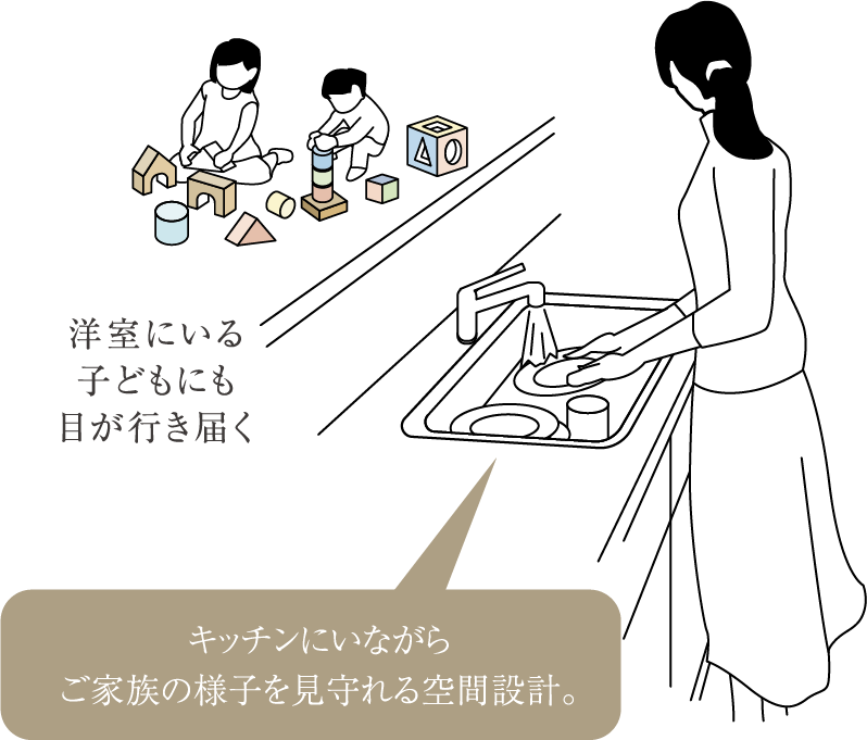 住まいの真ん中に配置した「ピアキッチンプラン」。家族が自然と集まってくる「場」になると評判です。