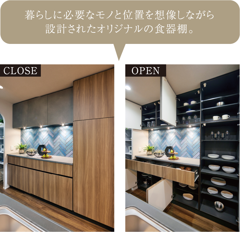 床から天井まで収納スペースを確保した備え付けの大型食器棚。「モデルルームの印象のままに住んでいただきたい」というこだわりから、標準装備にこだわっています。