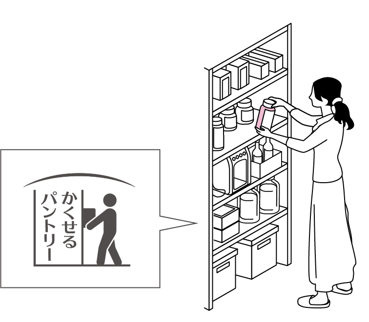 ストックはもちろん、調理家電も置けて、リビングから冷蔵庫も隠せます。