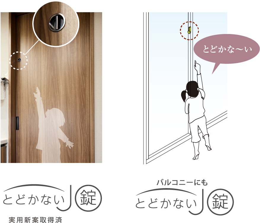 洗面室や浴室の危険を回避、洗面室のロックも高さ約1.6mに設置し、バルコニーのクレセント錠の位置も、子どもの手が届かない高さ約1.4mに設置。