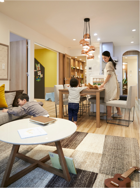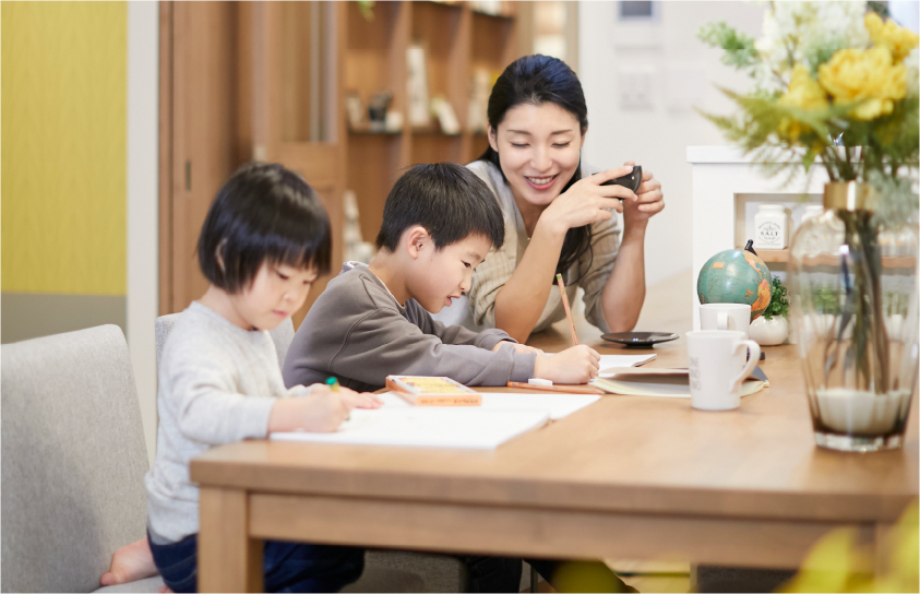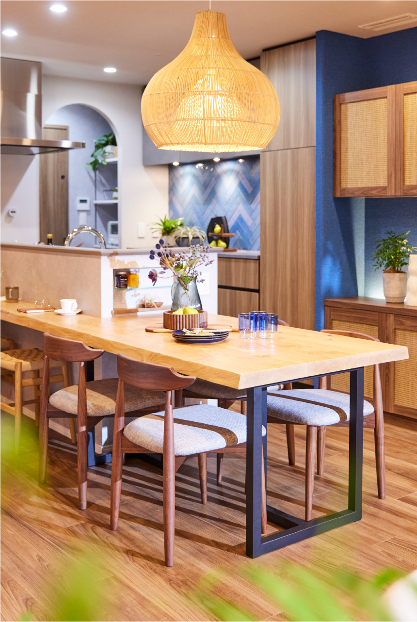 国産無垢材の一枚板を全プラン標準装備。家族がいつも集まる場所だから、本物の質感を時を重ねながら長く味わえる、贅沢な空間をお届けします。