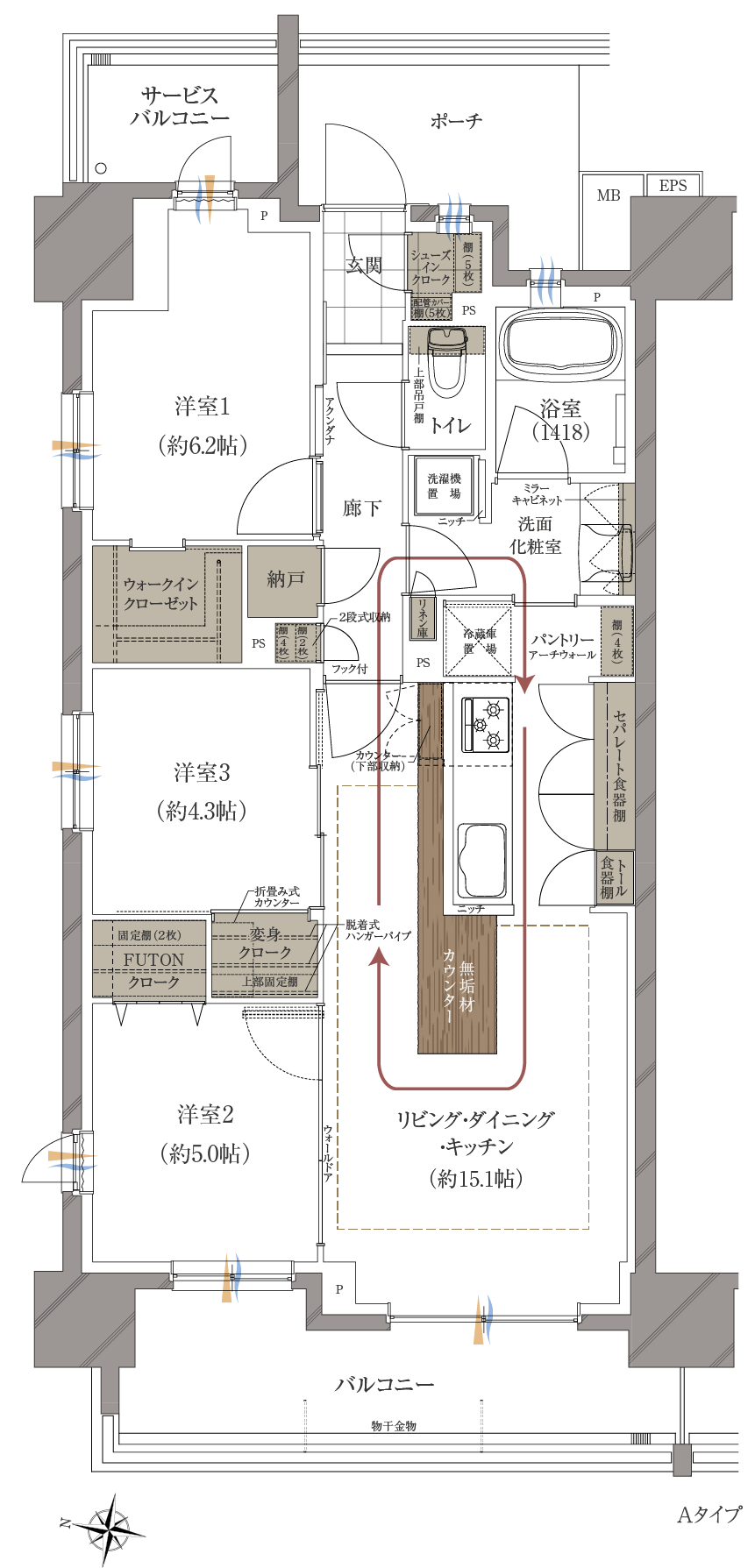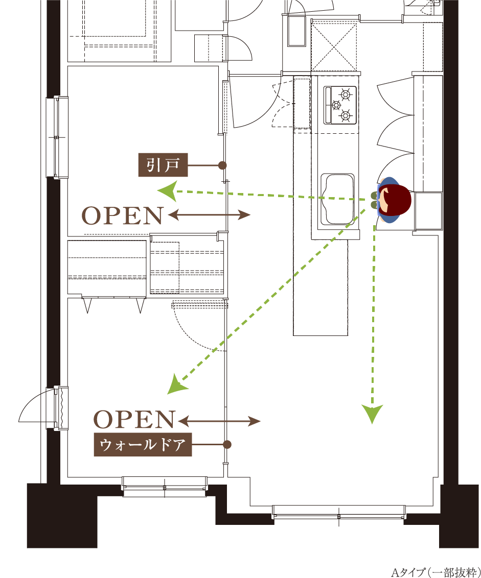 浴室窓から洗面室、キッチン、バルコニーへ風の通り道を確保。湿気や匂いのこもりがちな水まわり空間も爽やかに保ちます。