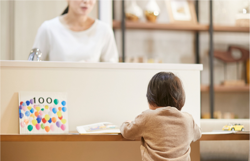 キッチン横のテーブルで配膳しながら、正面のカウンターで宿題や勉強をする子どもを見守りやすいスタイルです。