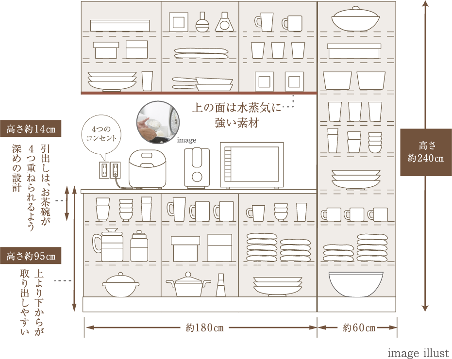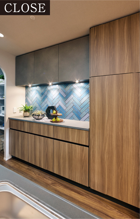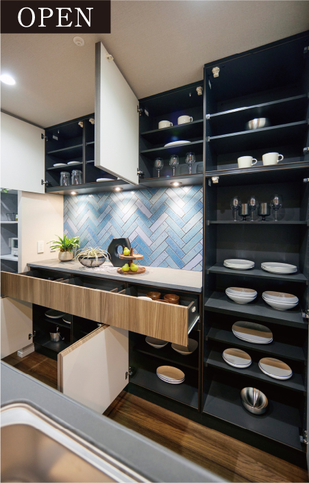 ぴったりサイズが美しい。キッチン背面に備え付け大型食器棚をご用意。効率良く大容量収納でき、ワイドなカウンターも使い勝手を考えた仕様です。