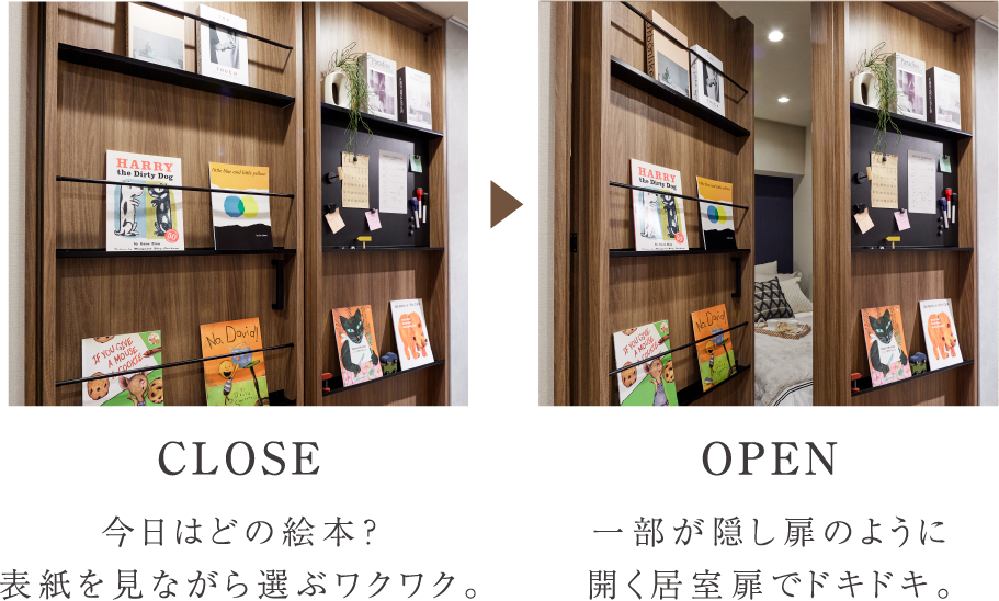 まだ文字の読めない小さなお子さまでも、絵本の表紙が見える収納だから選びやすい。廊下に造りつけの飾り棚は一部が隠し扉のような居室扉なので、毎日ワクワク。