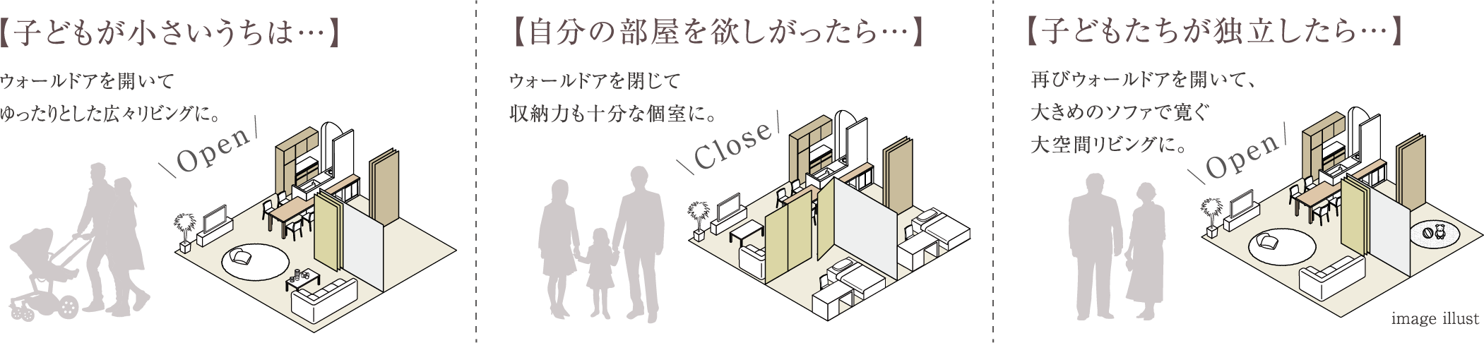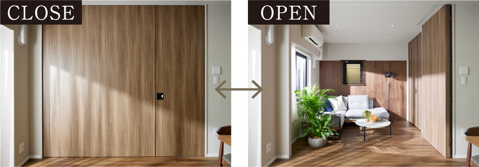 リビングに面する洋室にはウォールドアを採用。天井面まで開けるので、リビングとの一体感が高く暮らし方の変化に合わせて使い分けでき便利です。