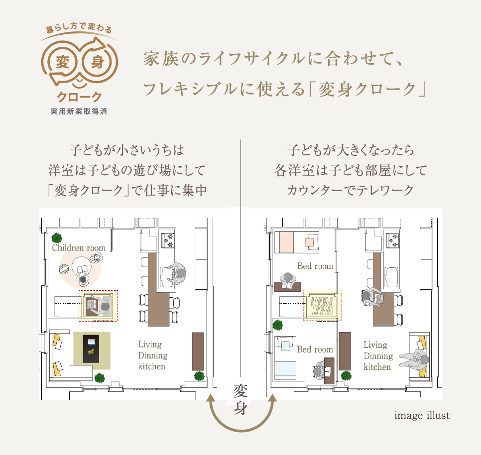 在宅ワークで仕事に集中できる個室が欲しいけど、ひと部屋使うのは難しい。そんな希望に応えるために、収納空間にも作業スペースにもなる「変身クローク」を採用しています。