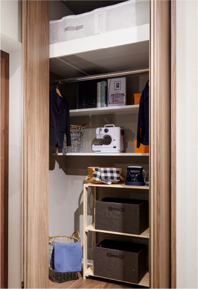 季節の寝具や来客用の布団もゆとりをもって収納できます。深い奥行きを利用した棚も設け、収納力をアップしました。 ※一部タイプ除く