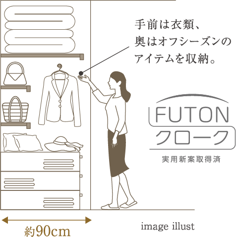 意外とかさばる布団をゆとりをもって収納できる、深い奥行きの収納空間をご用意。棚も備えているので様々な物を効率良く収納できます。