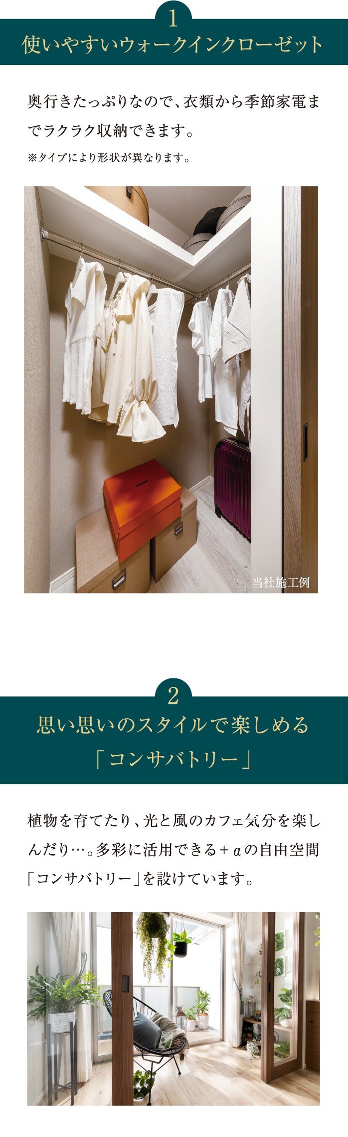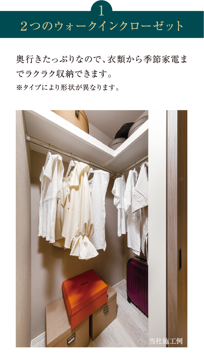 洋室(1)(2)それぞれにウォークインクローゼットを設けているので、ひとりでも二人でも使いやすい間取りです。