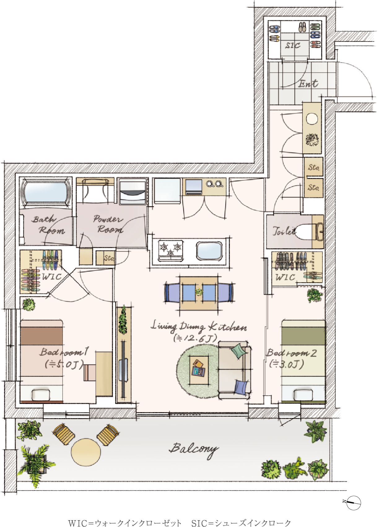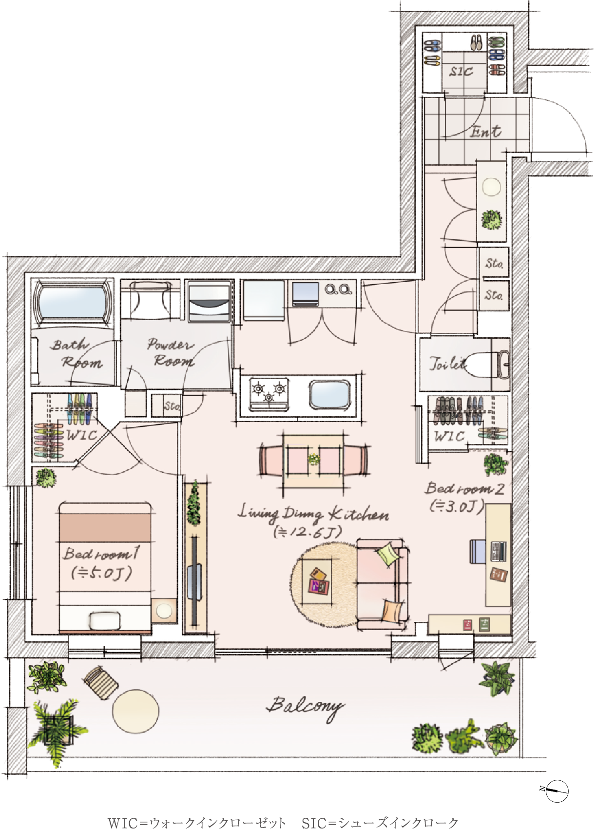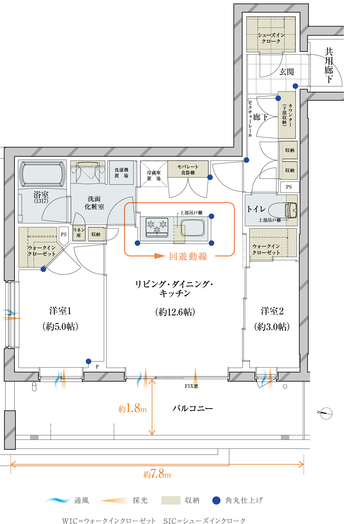 約7.8mのワイドバルコニー面にLDKと2つの洋室を配置した開放的な2LDKプランです。