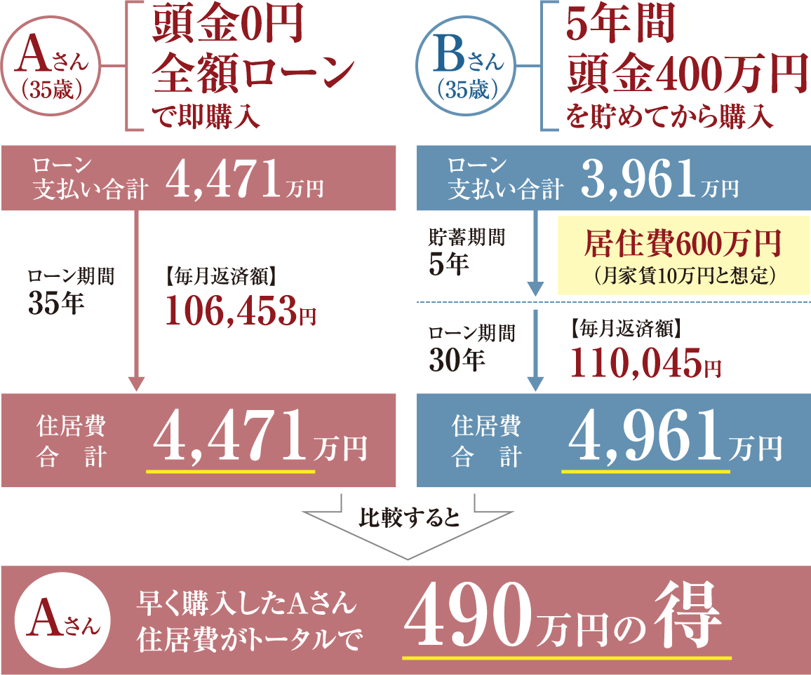 住宅ローンの総返済額だけを比較すると、Aさんの方が、Bさんよりも負担が大きくなります。しかし、Bさんには、自己資金(400万円)と、自己資金を貯める間の5年間の居住費(600万円と想定)の負担が発生します。トータルでは、全額ローンのAさんの方が得をするという結果になります。マンションを買うために、頭金を貯める必要はないといえます。※ ※上記の諸条件のもとでの結論であり、実際の結果を保証するものではありません。