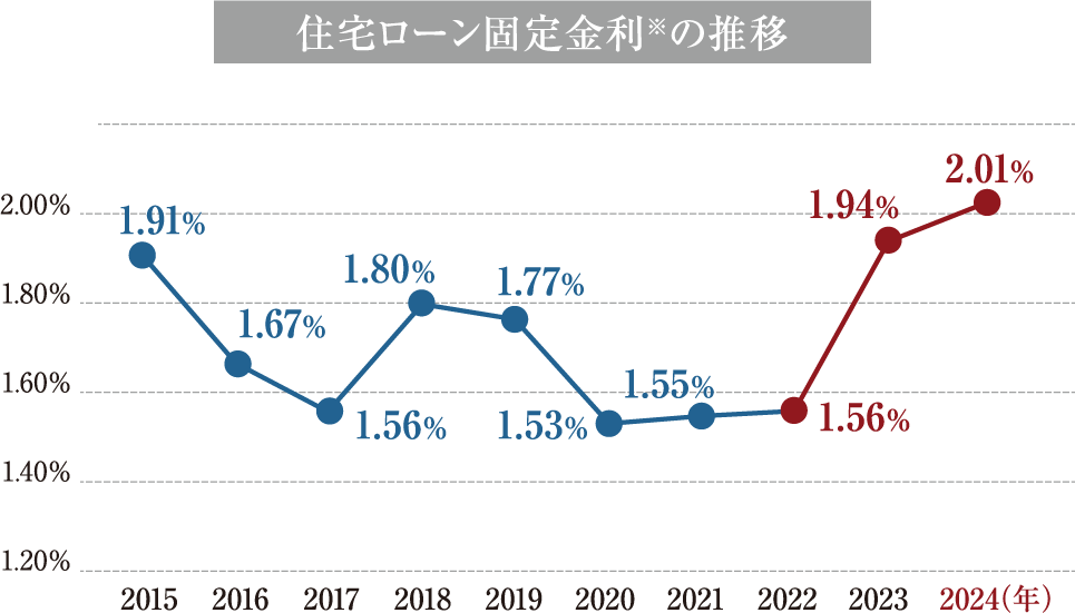 ※フラット35の返済期間21年以上・融資率9割超の最低金利(各年1月)。住宅金融普及協会調べ。