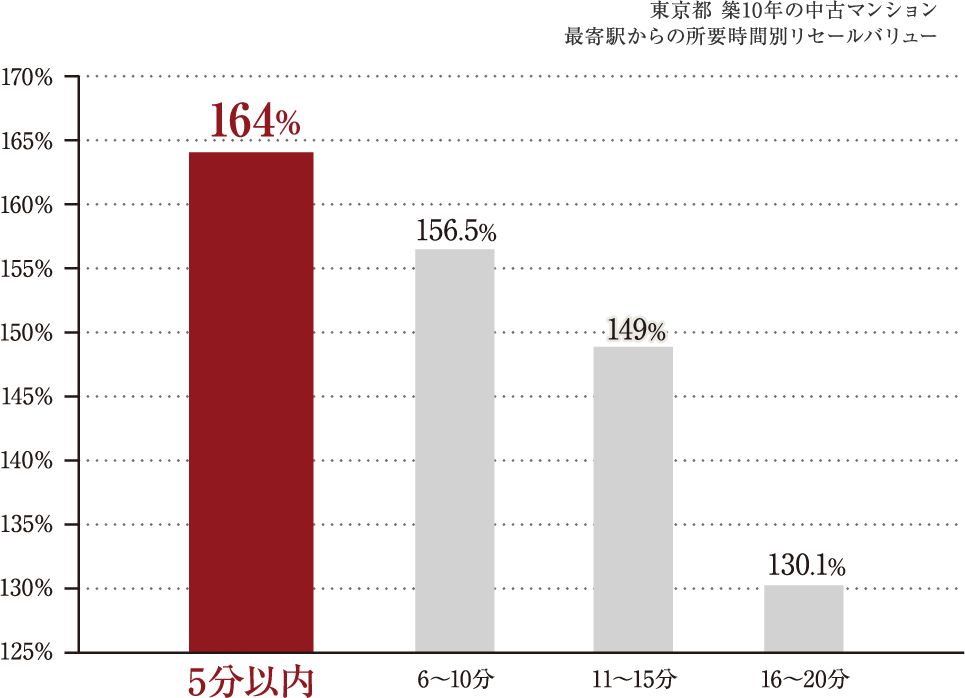 東京都内にある築10年の中古マンションのリセールバリューを最寄り駅からの所要時間で比較してみると、徒歩5分以内が164%と高い価格維持率を見せています。