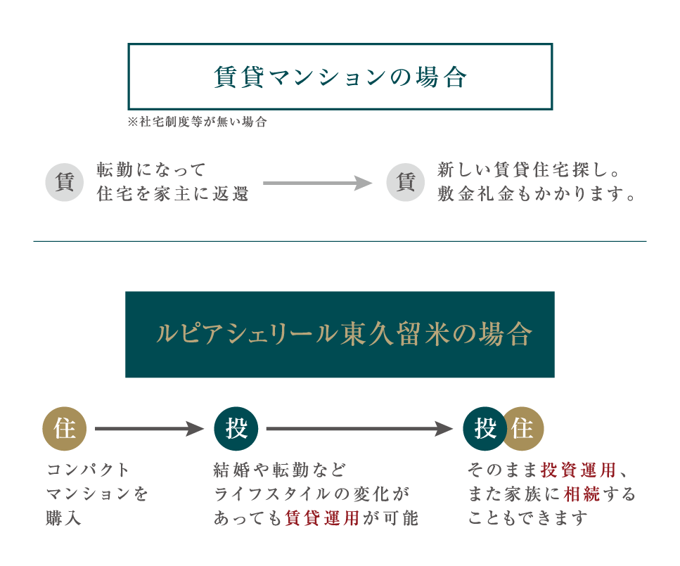 転勤などで住み続けることができなくなっても、将来の資産運用としての有効活用が可能です。投資運用または家族に相続することもできます。