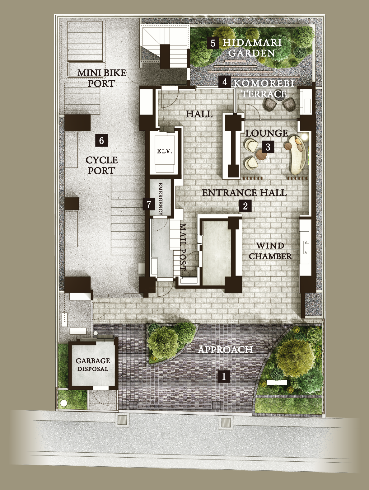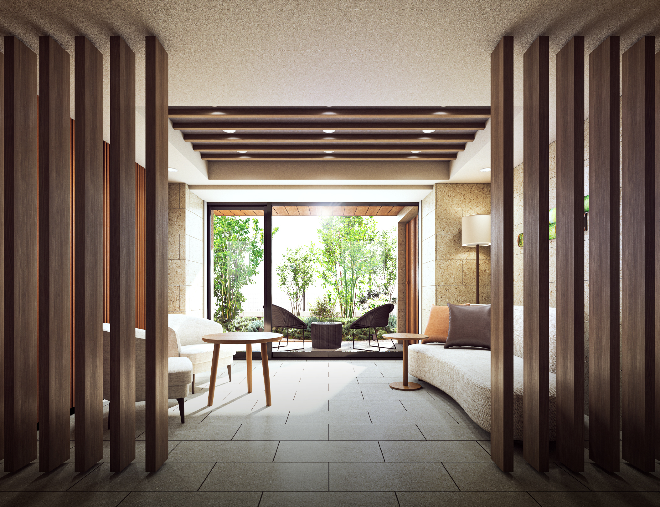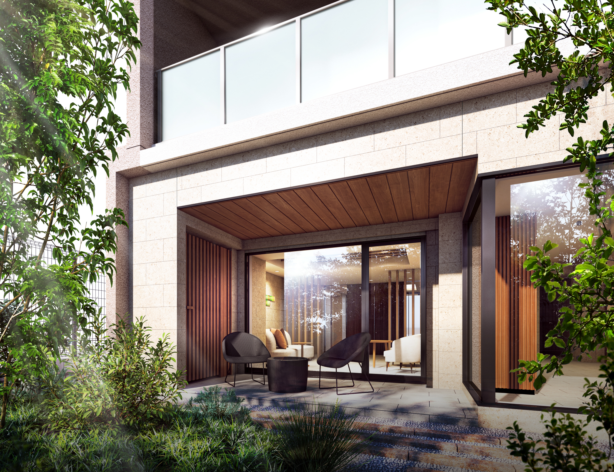 ラウンジの窓先には、奥庭と一体になったテラスを配置。通り抜ける風や光の移ろいが心地いい外空間が、それぞれの日常に満ち足りたひとときを演出します。
