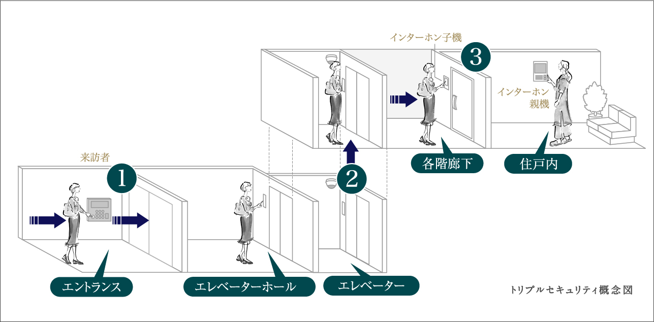 エントランスホールからエレベーターそして各住戸にセキュリティを施すことで不審者の侵入を防ぎます。