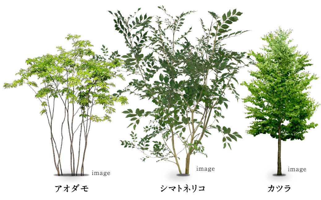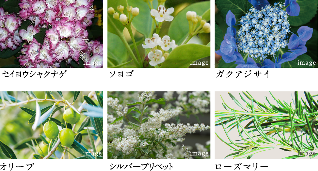 通年の緑で住まいに潤いを添える常緑樹を中心に、