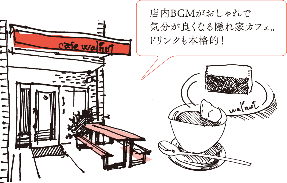 「cafewalnut」では、ハンドドリップで丁寧に淹れられたコーヒーや、ドイツの老舗紅茶ブランド「ロンネフェルト社」の上質な紅茶を楽しむことができます。手作りケーキも評判で、素材の風味を生かしたスイーツと、こだわりのドリンクとの組み合わせは、訪れるたびに新たな発見をもたらしてくれます。ペット同伴もOKなので、愛犬と一緒にカフェタイムを楽しめるのも嬉しいポイントです。