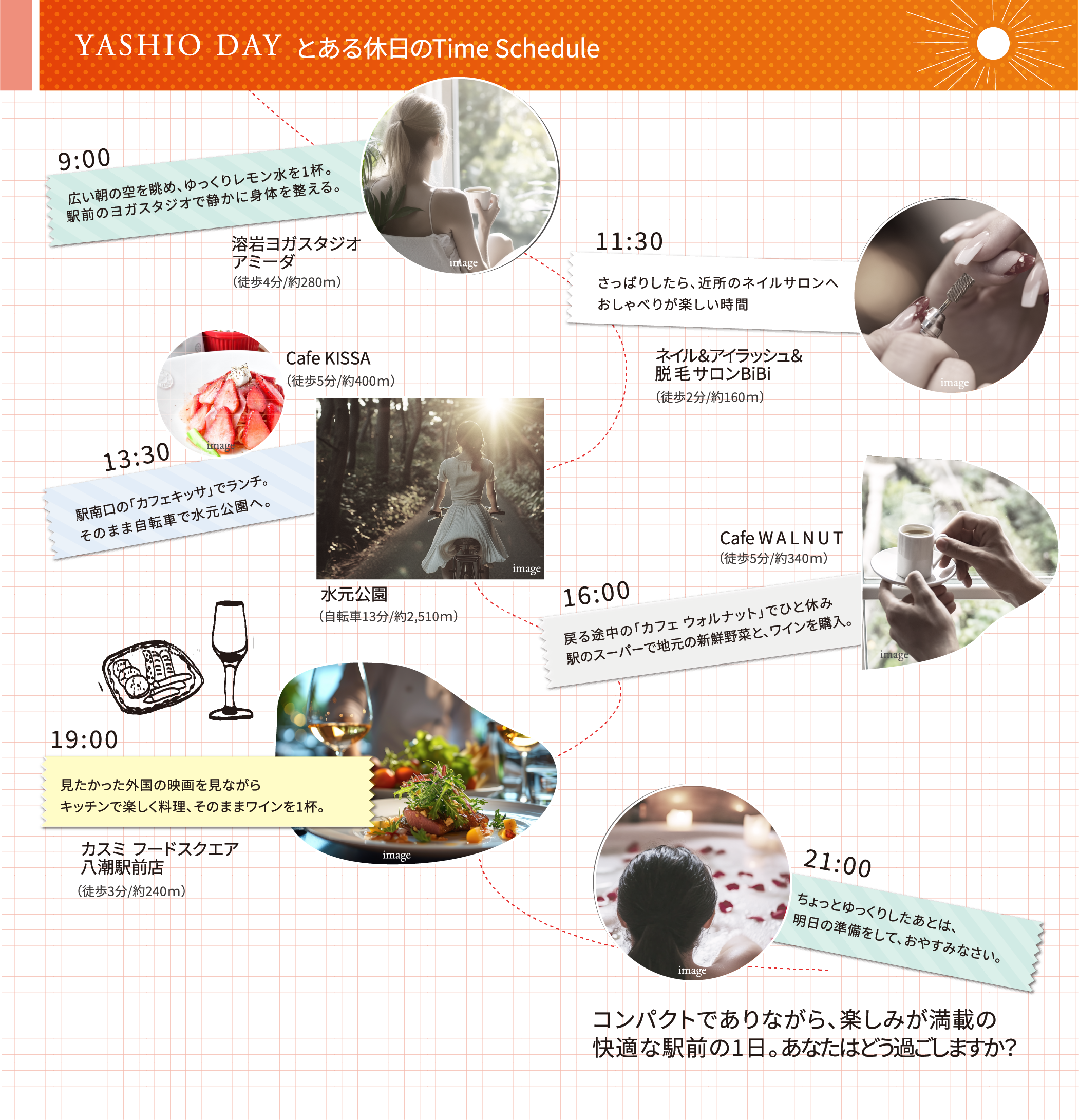八潮駅南口に隣接した都市型商業施設「ビビ八潮」には郵便局をはじめ、レストラン・クリニック・薬局・各種カルチャー&サービスなどの店舗が展開されています。1階には飲食店や雑貨店、2階には美容室やエステサロン、3階にはフィットネスジムなどが出店。気軽に、ポジティブな時間を過ごせそうです。