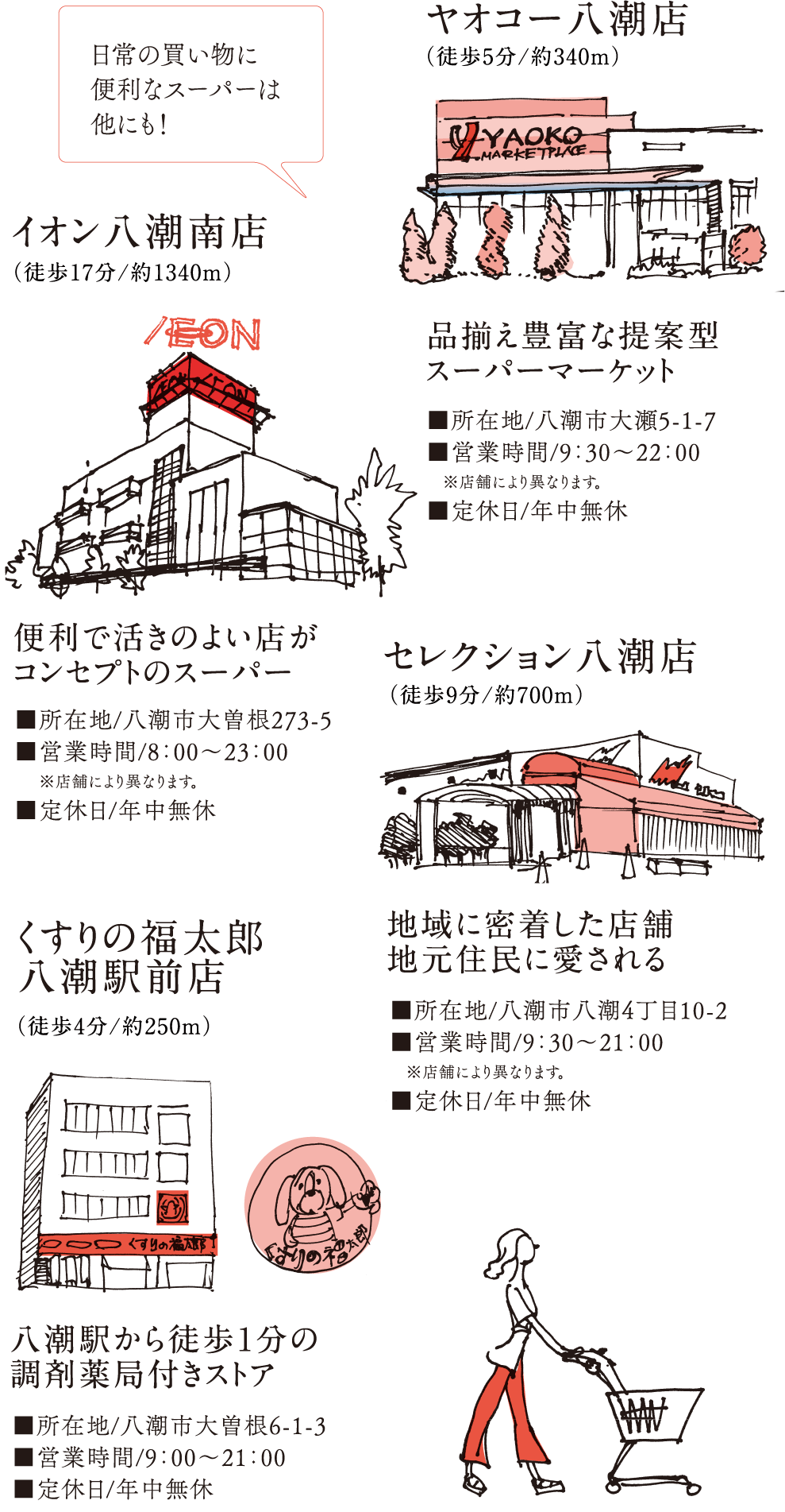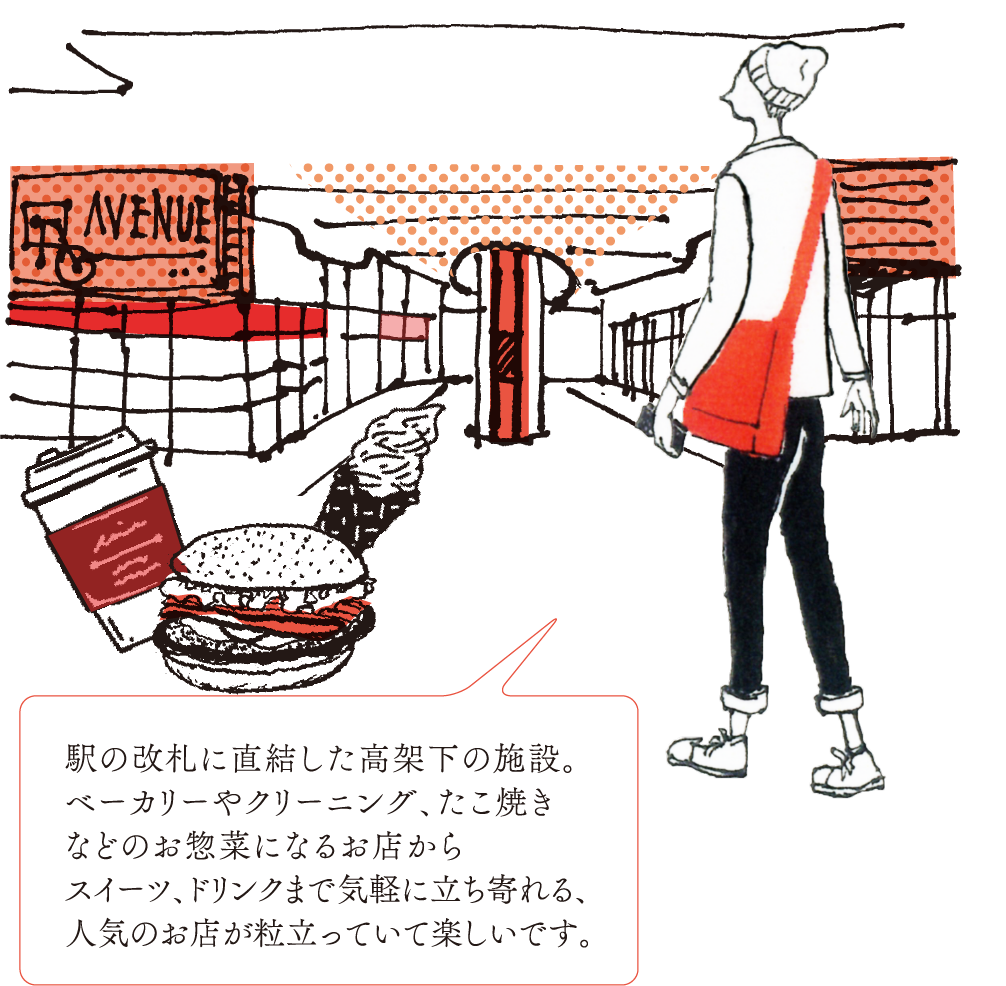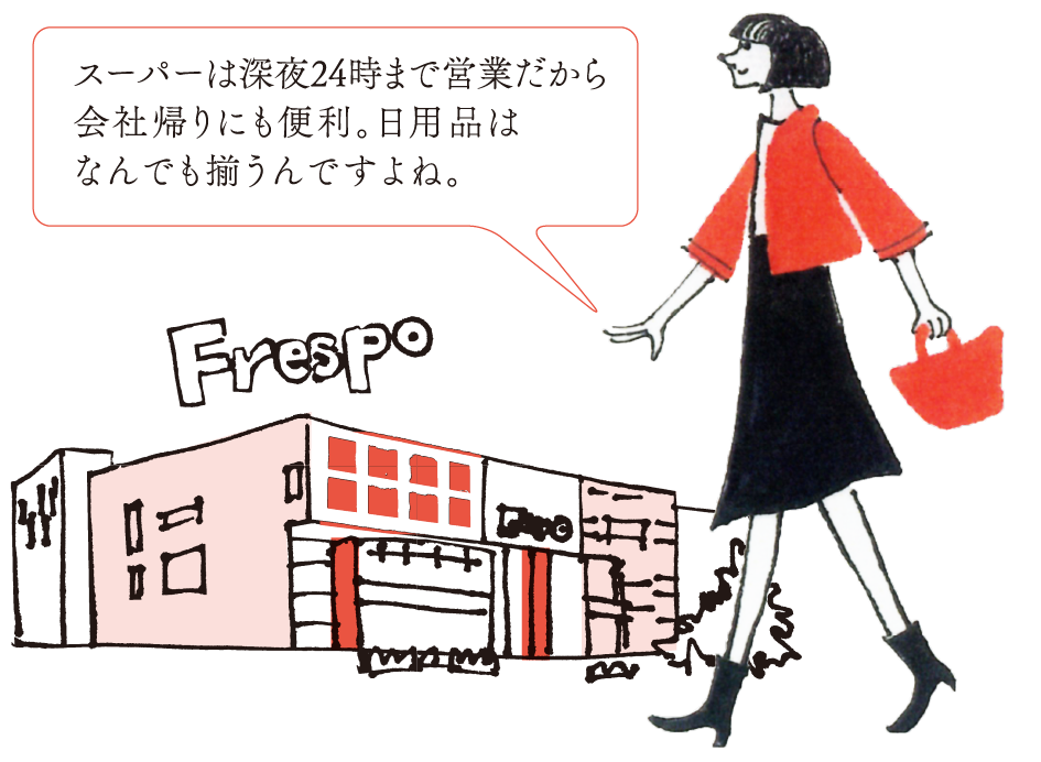 深夜24時まで営業しているスーパーを中心に、多彩な58もの専門店が勢揃い。家電、ファッション、グルメ、書店、クリニック、アミューズメント、ゴルフスクールやピラティススタジオも入居しています。
