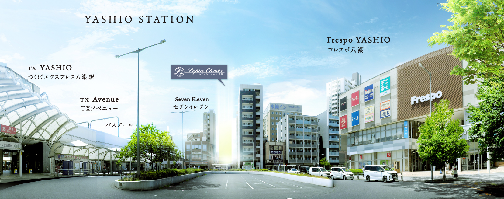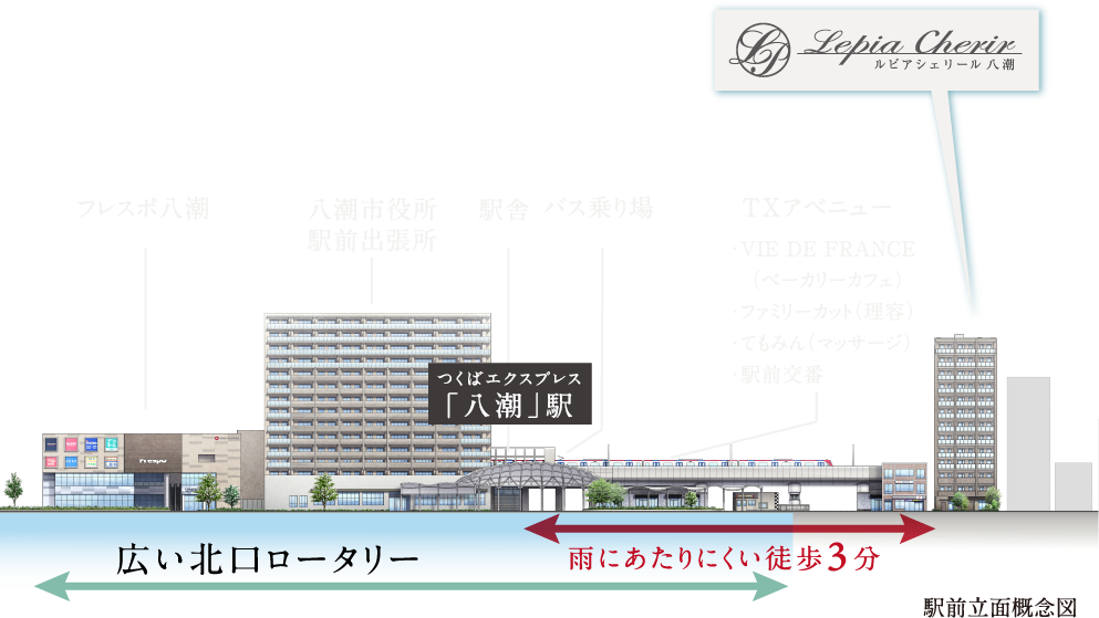 ※掲載の八潮駅前画像は2023年5月にバスロータリーに沿って撮影した画像をつなぎ合わせ、現地位置方向に合成加工を施したもので、実際の風景とは異なります。また、建設地はロータリー沿いではありません。※掲載の距離圏概念図はイメージです。※掲載の駅前立面概念図は「八潮」駅と線路を基準に、ロータリーにある駅前施設を並べ、物件との位置関係を表したイメージで、実際の風景とは異なります。また、物件エントランスの正面は線路と平行位置にはありません。あらかじめご了承ください。※掲載の環境写真は2023年4月に撮影したものです。※徒歩分数は80mを1分として算出しています。現地からの距離は地図上の概測です。