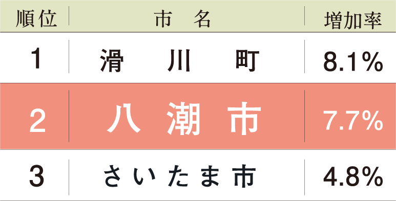 令和3年6月発表の国勢調査で、「八潮市」の人口増減率が7.7%UPで、堂々の第2位に。近年人口増加の傾向にある埼玉県内でも、八潮市が住みやすい街であることが伺います。