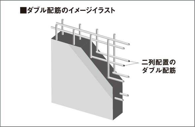 外壁・戸境壁は、コンクリート内に鉄筋を二重に組み上げたダブル配筋としました。シングル配筋よりも強度が高く、万一の地震にも強い建物を目指しています。