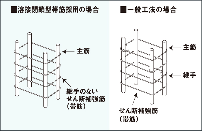 柱の主筋を囲むように巻き付けるフープは、柱のせん断強度を高める役割を果たしています。このフープに、溶接閉鎖型筋という鉄筋を使うことで、柱鉄筋自体の剛性を更に高める効果があります。 ※一部除く