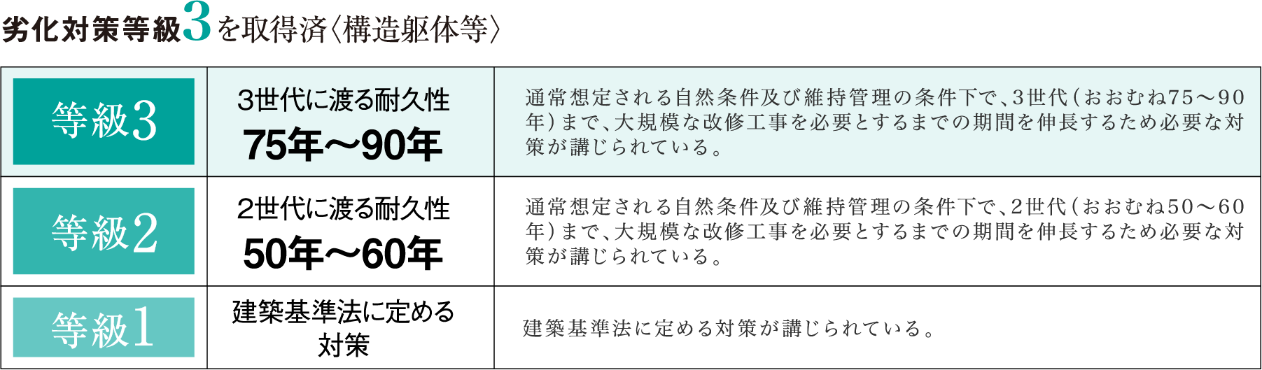 構造躯体等に使用する材料の交換等の大規模な改修工事を必要とするまでの期間を伸長するための必要な対策の程度を示しています。 ※表示性能は部材自体の単体性能であるため、実際の住宅内での性能とは異なる可能性があります。