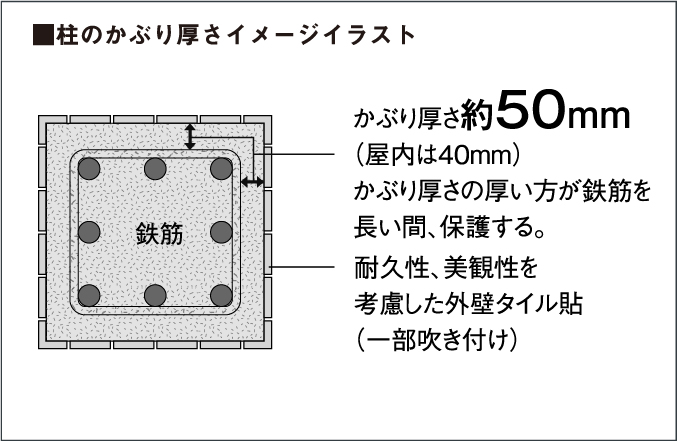 鉄筋を覆うコンクリートの厚さを「かぶり厚さ」といいます。コンクリートには鉄筋を錆びや火災から守る役目もあり、一定以上の「かぶり厚さ」をとる必要があります。当物件では建築基準法で定められた最低のかぶり厚さより10mm厚くしております。 ※一部土に接しない擁壁、耐圧スラブ除く