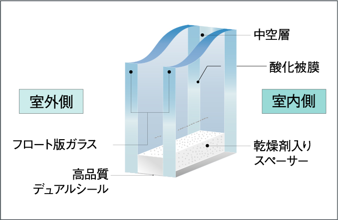 複層ガラス(Low-E)は2枚のガラスの間にある中空層が熱の伝わりを抑制するため、単層ガラスに比べ断熱性が高く、窓から逃げる熱を軽減して省エネルギーに貢献し、光熱費のコストダウンを実現します。また、室内側のガラスが冷えにくいため、ガラス表面の結露も生じにくくなります。