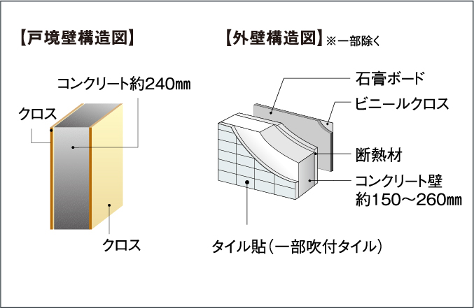 隣接住戸との戸境壁は遮音性を考慮。厚さを約240㎜を確保しました。また、外壁には断熱材を施し、断熱性を高めています。