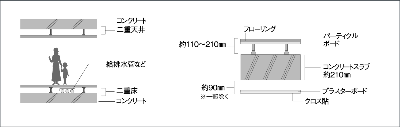 床は振動など上下階の生活音を防ぎ、天井は一部周波数を低減することで、プライバシーに配慮した二重床・二重天井構造としました。このことで、優れた遮音効果・断熱効果を発揮します。また設備配管等をコンクリートに埋め込んでいないのでメンテナンス・リフォームが容易にできます。 ※全ての音を防止できない場合がございます。