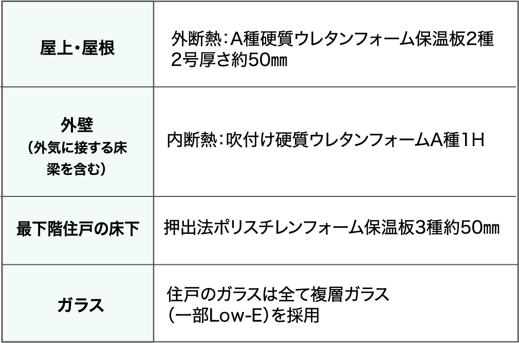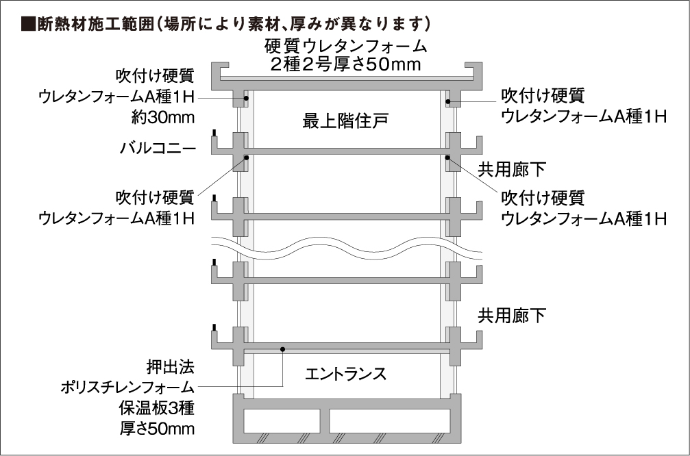 結露対策として、外部の熱や冷気が伝わりにくいように断熱性を高めるため、屋上・外壁・最下階住戸床下など、建物の随所に断熱材を施し、より効果的な断熱対策を採用しています。特に外壁は、硬質発泡ウレタンを吹き付け断熱することで、住まいの大敵である結露防止に配慮しています。