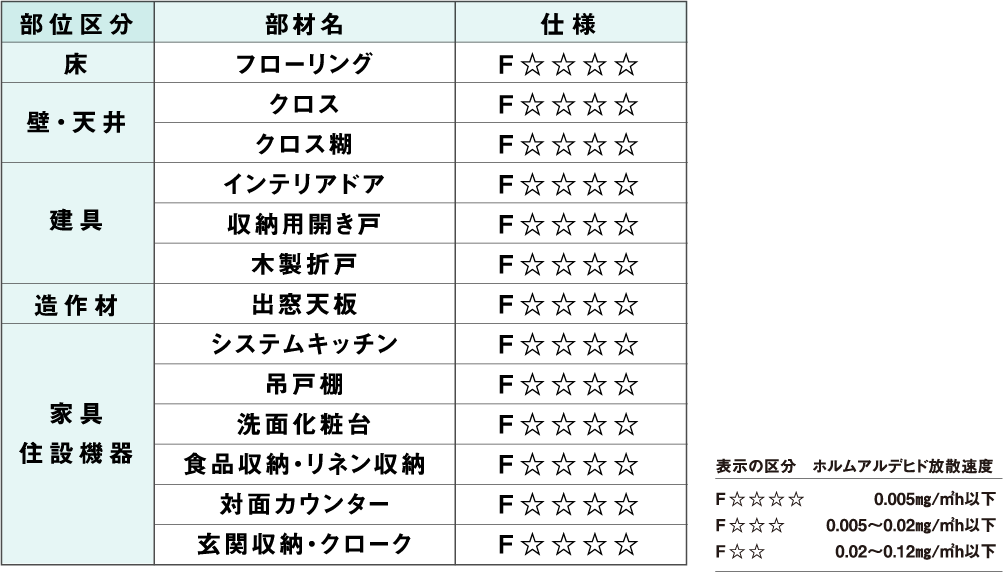 建材や接着剤に含まれる有害化学物質の人体への影響を可能な限り排除するため、健康に配慮したノンホルムアルデヒドのクロス接着剤や低ホルムアルデヒド(F☆☆☆☆レベル)の床・壁材などを採用しました。F☆☆☆☆とは日本工業規格(JIS)および日本農林規格(JAS)において定められたホルムアルデヒドの拡散量の区分を示すものです。