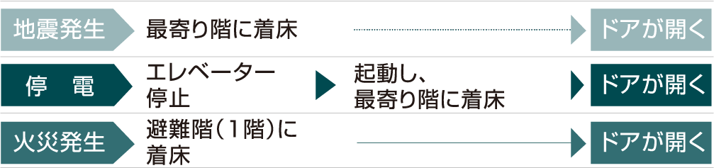 地震を感知すると、運転中でも素早く最寄りの階に停止し、ドアが自動的に開く、地震管制装置付きのエレベーターを採用しています。停電した場合も専用バッテリー電源で救出運転を行いますので安心です。また、停電時でもインターホンで外部と連絡を取ることができます。