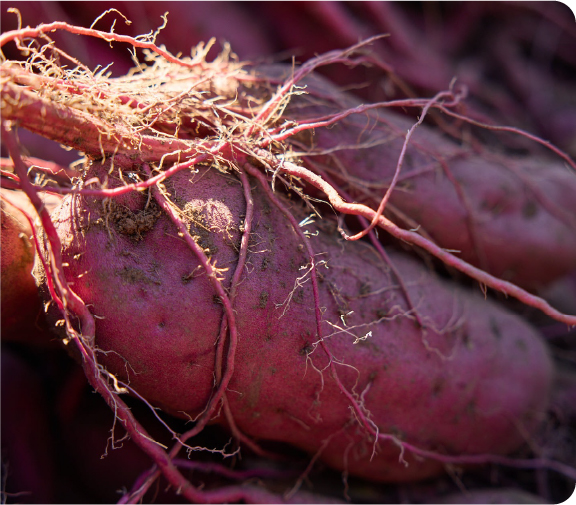 三芳町で作られている「富の川越いも」。上品な甘さが特徴の「紅赤」、鮮やかな紫色の「パープルスイートロード」、2013年に誕生した新種の「シルクスイート」など品種も多彩です。